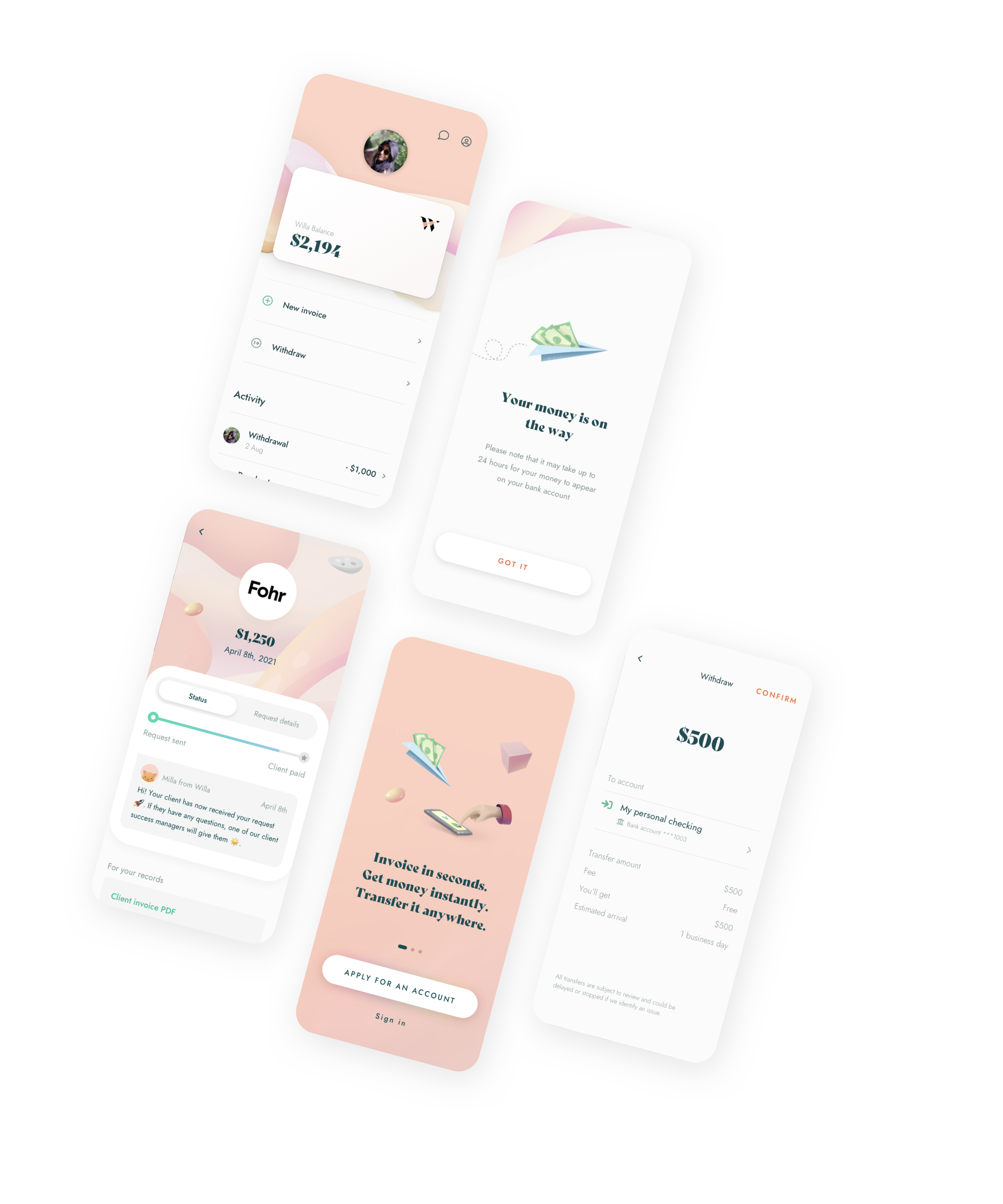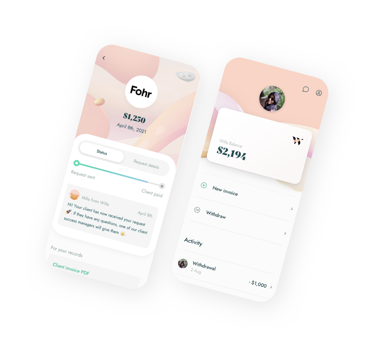 When you use Willa to get paid, you’re charged a small fee. It's deducted automatically from the total invoice amount. Your money is always available immediately.